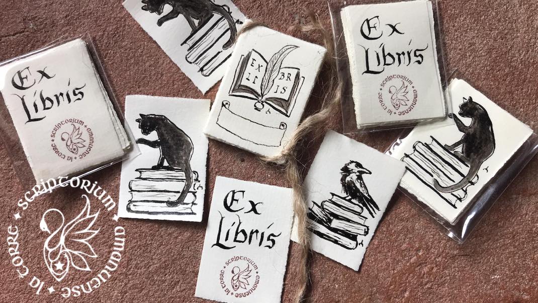 Gatto sui libri - confezione di 20 Ex Libris decorati e scritti a mano a pennino ed inchiostro - (ID# SCO02) per personalizzazioni CONTATTA DenebL'Ex Libris è il modo più elegante ed esclusivo per personalizzare i propri libri e non solo: anche quaderni, agende, diari, scatole, corrispondenza, inviti...ecc saranno contraddistinti in modo originale e con un tocco di prestigio. Col termine Ex libris (che in latino sta per 'dai libri') ci si riferisce ad un'etichetta, solitamente ornata da una rappresentazione grafica, talvolta accompagnata da un breve scritto, che si applica su un libro per indicarne il proprietario. L'Ex Libris ha origini molto antiche: normalmente intagliato su una matrice di legno per poter essere stampato con la xilografia su un piccolo supporto di carta pregiata.....